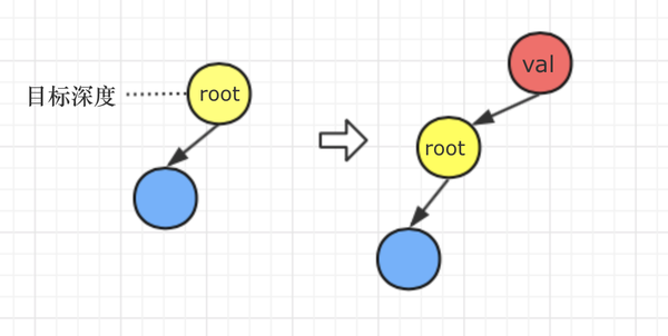 如果 d 的值为 1,深度 d - 1 不存在,则创建一个新的根节点 v,原先的整棵树将作为 v 的左子树。