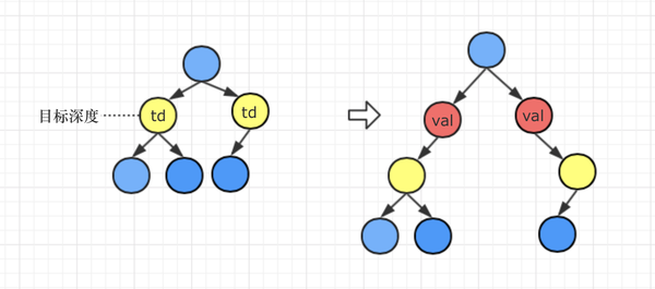 /** * @param {v} val,插入节点携带的值 * @param {cd} current depth,递归当前深度 * @param {td} target depth, 目标深度 * @param {isLeft} 判断原目标深度的节点是在左子树还是右子树 */ var traversal = function (node, v, cd, td, isLeft) { debugger; if (cd === td) { const newNode = new TreeNode (v); // 如果原来是左子树,重置后目标节点还是在左子树上,否则相反 if (isLeft) { newNode.left = node; } else { newNode.right = node; } return newNode; } // 处理上述的第1和第2种情况 if (node.left || (node.left === null && cd + 1 === td)) { node.left = traversal (node.left, v, cd + 1, td, true); } if (node.right || (node.right === null && cd + 1 === td)) { node.right = traversal (node.right, v, cd + 1, td, false); } return node; }; /** * Definition for a binary tree node. * function TreeNode(val) { * this.val = val; * this.left = this.right = null; * } */ /** * @param {TreeNode} root * @param {number} v * @param {number} d * @return {TreeNode} */ var addOneRow = function (root, v, td) { // 处理目标深度为1的情况,也就是上述的第3种情况 if (td === 1) { const n = new TreeNode (v); n.left = root; return n; } traversal (root, v, 1, td); return root; };