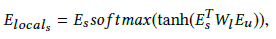 这是一个乘法注意力,Wl ∈ Rhxh 表示转换矩阵,Es 表示种子用户,Eu 表示目标用户,Elocal 为种子用户的 local info。