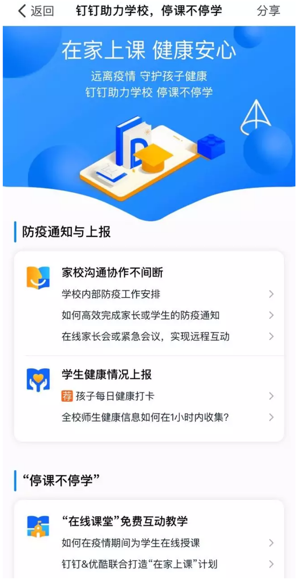 紧接着,阿里巴巴旗下的钉钉发起了“在家上课”计划,将“在线课堂”功能免费开放给全国大中小学使用,并覆盖广大农村地区的学校。同时,钉钉的群直播“连麦功能”也将免费开放。