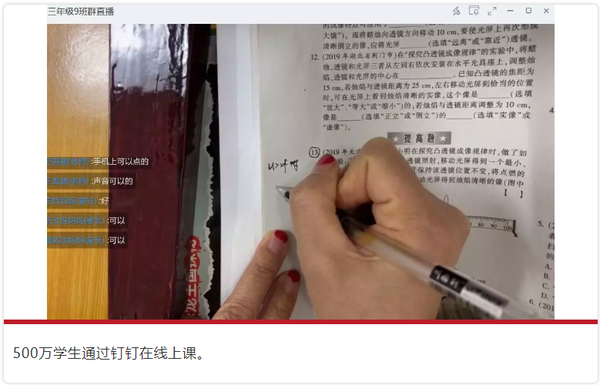 同一天晚上八点,浙江宁波的镇海仁爱中学也有两堂课在钉钉上同步进行。一堂是25分钟的英语课,讲解了“过去完成时”;一堂是10分钟的科学课,讲解了寒假作业中的难题。