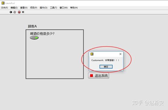 (13)运行Launch.vi,首先弹出两个对话,点击确认时,弹出“非常感谢”,证明程序调用成功。