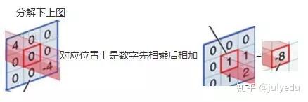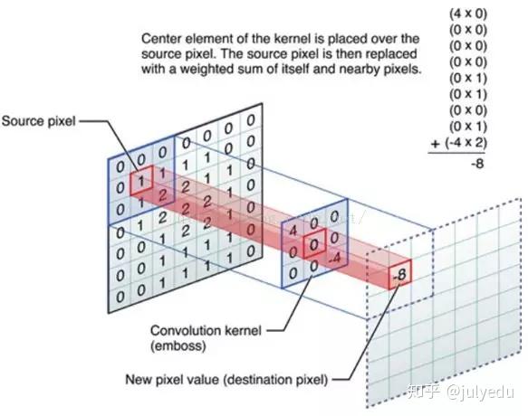中间滤波器filter与数据窗口做内积,其具体计算过程则是:4*0 + 0*0 + 0*0 + 0*0 + 0*1 + 0*1 + 0*0 + 0*1 + -4*2 = -8