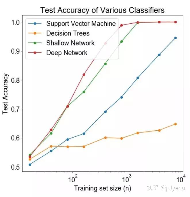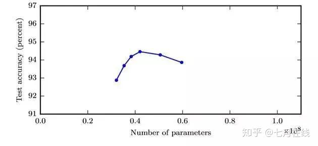 83、下图显示了训练过的3层卷积神经网络准确度,与参数数量(特征核的数量)的关系。
