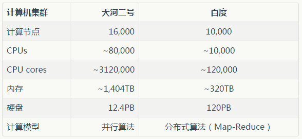 可见就计算能力来说,分布式计算集群在并行计算集群面前就是小巫见大巫,完全不是一个数量级,但所针对和解决的问题也是不同的。下图比较了天河二号和百度集群的一些规模参数: