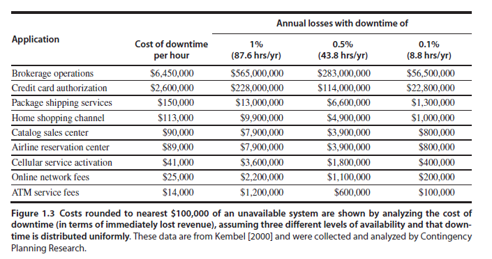 下面这张图是《Computer Architecture : A Quantitative Approach (5th edition)》给出的各场景宕机时长平均带来的损失,还是2000年统计的老数据:
