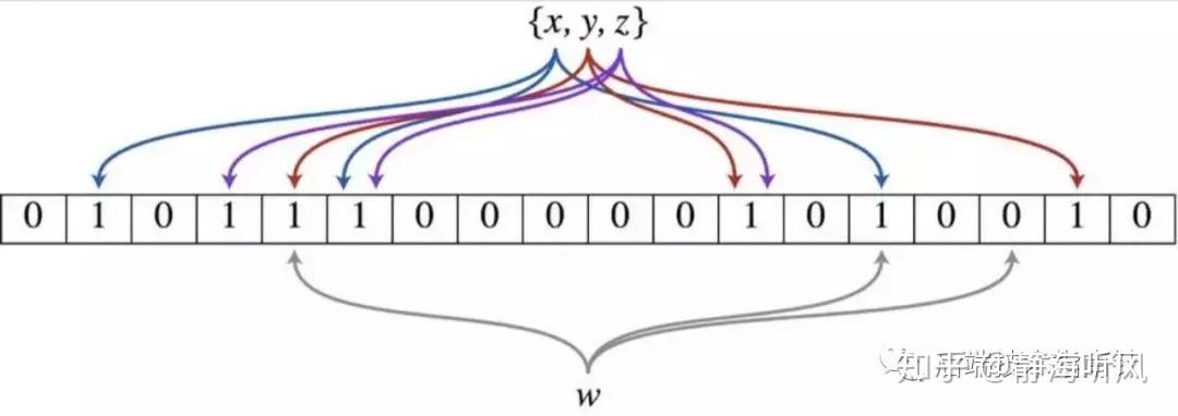 假如现在有三个哈希函数分别为h1,h2,h3,同时有三个输入x,y,z。三个输入分别通过h1-h3进行哈希计算出对应整数之后,对bitarray的长度进行取模运算,获取对应下标再进行置1,这样运算三次就形成了如图的bitmap结构: