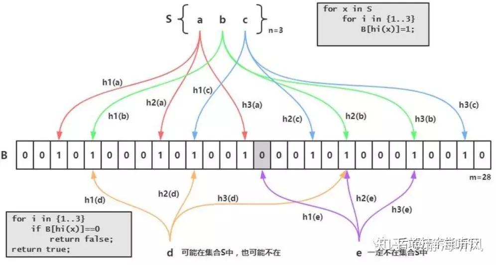 两个组件的功能也非常明确,位阵列就是存储对应位的值是0/1的二进制向量,哈希函数的作用是将原始输入经过数学运算转换为一个数字值,哈希函数是加密和安全的基础,也是数学的伟大体现,感兴趣可以进一步学习其基本原理。