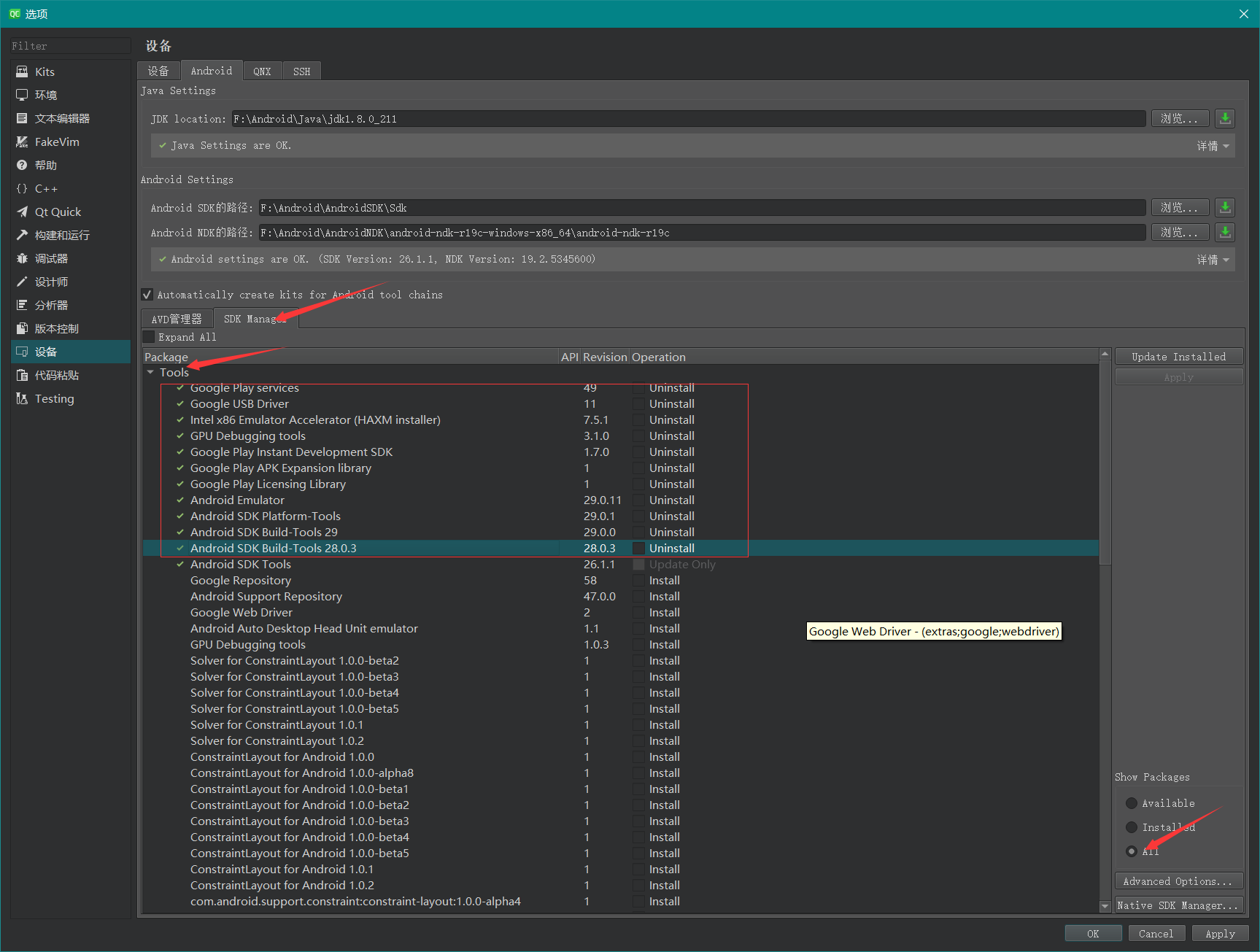 到SDK 管理页面,安装一堆必要的工具和镜像。注意Android SDK Build Tool , 能用的是28.0.3,最新的29用不了。