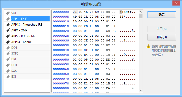 下图中是用MagicEXIF打开的一张被Photoshop修改过的JPEG图像结构(置灰的段是与JPEG编码解码有关的,而没有置灰、以APP开头的段便是该图像的元数据):