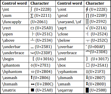 【2月19日突然发现如何做到像使用 LaTeX 那样优雅地使用 Word? - mewing 的回答这里有更详细的有关公式的解说,并且给出了http://unicode.org/notes/tn28/UTN28-PlainTextMath-v3.pdf这份微软提供个Unicode的详细文档,大家可以详细看这个文档的第30页,看看很多和\matrix地位相同的环境控制符号