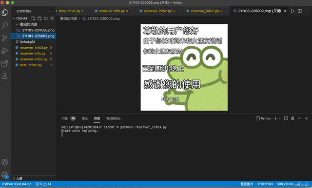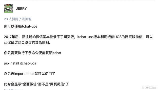 但没想到,复现到这一步时就出问题了。直接用itchat库像上面这样操作,登陆的会是微信的网页版,而腾讯之前为了防止大家用计算机自动化操作微信从而可能会导致一些安全问题,封停了网页版微信API,如果只是像上面这样做的话,控制台会提醒说“由于安全原因,此微信号不能使用网页版微信。你可以使用+Windows+版微信或+Mac+版微信登录。”