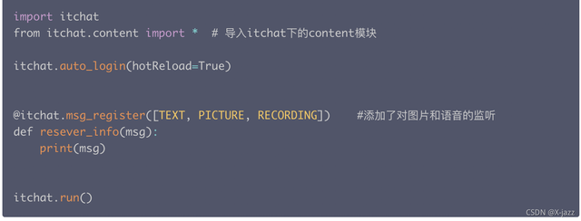 六、@itchat.msg_register([TEXT, PICTURE, RECORDING])