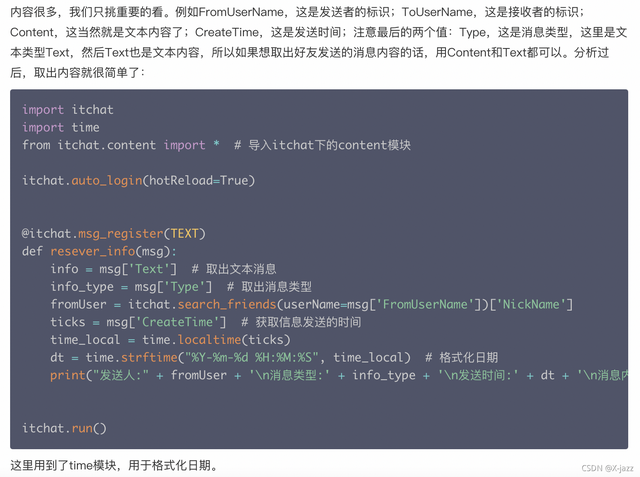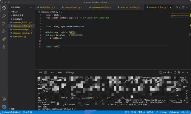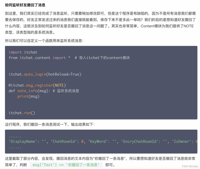 import itchat from itchat.content import * import os import time import xml.dom.minidom # 解析xml模块 # 这是保存撤回消息的文件目录(如:图片、语音等),这里已经写死了,大家可以自行修改 temp = \'/Users/yourname/Documents/itchat\' + \'/\' + \'撤回的消息\' if not os.path.exists(temp): os.mkdir(temp) itchat.auto_login(True) # 自动登录 dict = {} # 定义一个字典 # 这是一个装饰器,给下面的函数添加新功能 # 能够捕获好友发送的消息,并传递给函数参数msg @itchat.msg_register([TEXT, PICTURE, FRIENDS, CARD, MAP, SHARING, RECORDING, ATTACHMENT, VIDEO]) # 文本,语音,图片 def resever_info(msg): global dict # 声明全局变量 info = msg[\'Text\'] # 取出消息内容 msgId = msg[\'MsgId\'] # 取出消息标识 info_type = msg[\'Type\'] # 取出消息类型 name = msg[\'FileName\'] # 取出消息文件名 # 取出消息发送者标识并从好友列表中检索 fromUser = itchat.search_friends(userName=msg[\'FromUserName\'])[\'NickName\'] ticks = msg[\'CreateTime\'] # 获取信息发送的时间 time_local = time.localtime(ticks) dt = time.strftime("%Y-%m-%d %H:%M:%S", time_local) # 格式化日期 # 将消息标识和消息内容添加到字典 # 每一条消息的唯一标识作为键,消息的具体信息作为值,也是一个字典 dict[msgId] = {"info": info, "info_type": info_type, "name": name, "fromUser": fromUser, "dt": dt} @itchat.msg_register(NOTE) # 监听系统提示 def note_info(msg): # 监听到好友撤回了一条消息 if \'撤回了一条消息\' in msg[\'Text\']: # 获取系统消息中的Content结点值 content = msg[\'Content\'] # Content值为xml,解析xml doc = xml.dom.minidom.parseString(content) # 取出msgid标签的值 result = doc.getElementsByTagName("msgid") # 该msgId就是撤回的消息标识,通过它可以在字典中找到撤回的消息信息 msgId = result[0].childNodes[0].nodeValue # 从字典中取出对应消息标识的消息类型 msg_type = dict[msgId][\'info_type\'] if msg_type == \'Recording\': # 撤回的消息为语音 recording_info = dict[msgId][\'info\'] # 取出消息标识对应的消息内容 info_name = dict[msgId][\'name\'] # 取出消息文件名 fromUser = dict[msgId][\'fromUser\'] # 取出发送者 dt = dict[msgId][\'dt\'] # 取出发送时间 recording_info(temp + \'/\' + info_name) # 保存语音 # 拼接提示消息 send_msg = \'【发送人:】\' + fromUser + \'\n\' + \'发送时间:\' + dt + \'\n\' + \'撤回了一条语音\' itchat.send(send_msg, \'filehelper\') # 将提示消息发送给文件助手 # 发送保存的语音 itchat.send_file(temp + \'/\' + info_name, \'filehelper\') del dict[msgId] # 删除字典中对应的消息 print("保存语音") elif msg_type == \'Text\': text_info = dict[msgId][\'info\'] # 取出消息标识对应的消息内容 fromUser = dict[msgId][\'fromUser\'] # 取出发送者 dt = dict[msgId][\'dt\'] # 取出发送时间 # 拼接提示消息 send_msg = \'【发送人:】\' + fromUser + \'\n\' + \'发送时间:\' + dt + \'\n\' + \'撤回内容:\' + text_info # 将提示消息发送给文件助手 itchat.send(send_msg, \'filehelper\') del dict[msgId] # 删除字典中对应的消息 print("保存文本") elif msg_type == \'Picture\': picture_info = dict[msgId][\'info\'] # 取出消息标识对应的消息内容 fromUser = dict[msgId][\'fromUser\'] # 取出发送者 dt = dict[msgId][\'dt\'] # 取出发送时间 info_name = dict[msgId][\'name\'] # 取出文件名 picture_info(temp + \'/\' + info_name) # 保存图片 # 拼接提示消息 send_msg = \'【发送人:】\' + fromUser + \'\n\' + \'发送时间:\' + dt + \'\n\' + \'撤回了一张图片\' itchat.send(send_msg, \'filehelper\') # 将图片发送给文件助手 # 发送保存的语音 itchat.send_file(temp + \'/\' + info_name, \'filehelper\') del dict[msgId] # 删除字典中对应的消息 print("保存图片") itchat.run()