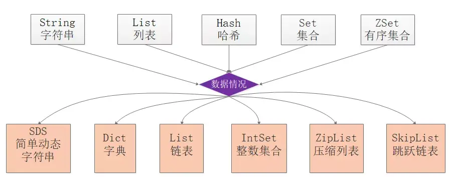 Redis为了平衡空间和时间效率,针对value的具体类型在底层会采用不同的数据结构来实现,其中哈希表和压缩列表是复用比较多的数据结构,如下图展示了对外数据类型和底层数据结构之间的映射关系: