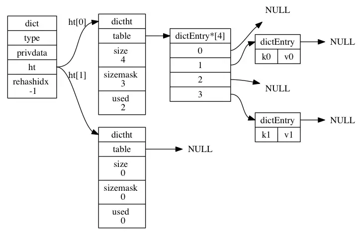 //哈希节点结构 typedef struct dictEntry { void *key; union { void *val; uint64_t u64; int64_t s64; double d; } v; struct dictEntry *next; } dictEntry; //封装的是字典的操作函数指针 typedef struct dictType { uint64_t (*hashFunction)(const void *key); void *(*keyDup)(void *privdata, const void *key); void *(*valDup)(void *privdata, const void *obj); int (*keyCompare)(void *privdata, const void *key1, const void *key2); void (*keyDestructor)(void *privdata, void *key); void (*valDestructor)(void *privdata, void *obj); } dictType; /* This is our hash table structure. Every dictionary has two of this as we * implement incremental rehashing, for the old to the new table. */ //哈希表结构 该部分是理解字典的关键 typedef struct dictht { dictEntry **table; unsigned long size; unsigned long sizemask; unsigned long used; } dictht; //字典结构 typedef struct dict { dictType *type; void *privdata; dictht ht[2]; long rehashidx; /* rehashing not in progress if rehashidx == -1 */ unsigned long iterators; /* number of iterators currently running */ } dict;