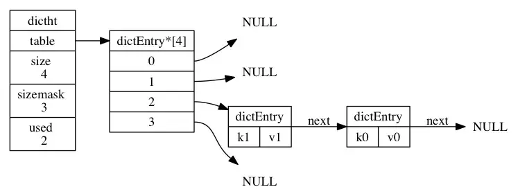 如上图展示了一个大小为4的table中的哈希节点情况,其中k1和k0在index=2发生了哈希冲突,进行开链表存在,本质上是先存储的k0,k1放置是发生冲突为了保证效率直接放在冲突链表的最前面,因为该链表没有尾指针。