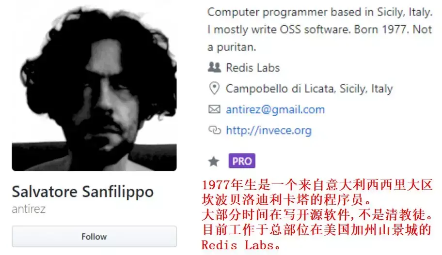 Redis是一个使用ANSI C编写的开源、支持网络、基于内存、可选持久化的高性能键值对数据库。Redis的之父是来自意大利的西西里岛的Salvatore Sanfilippo,Github网名antirez,笔者找了作者的一些简要信息并翻译了一下,如图: