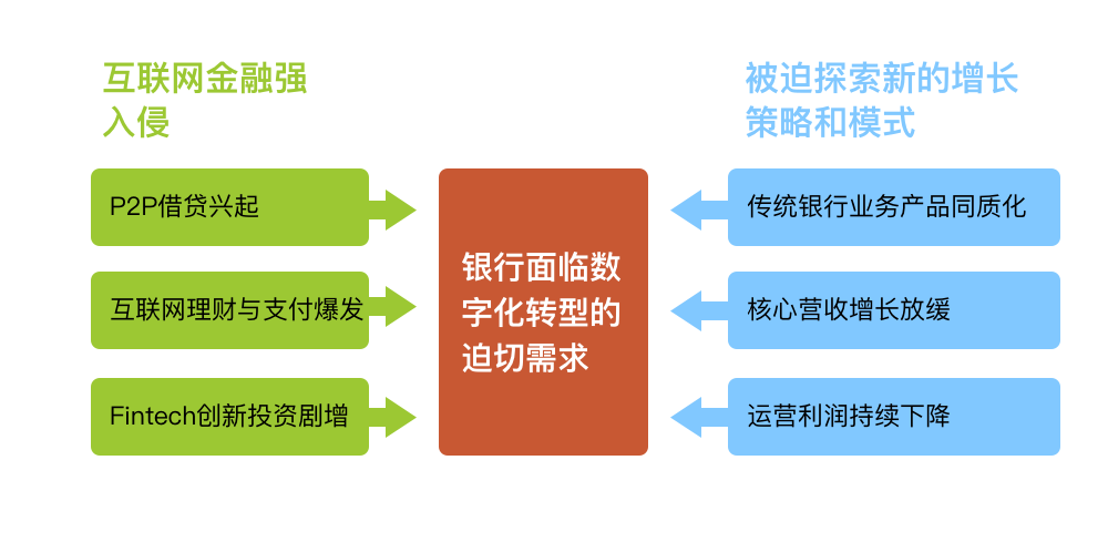 然而,到2014年,包括招商银行在内的整个商业银行业面临内忧外患。一方面是互联网金融的强势入侵,在存贷汇三方面冲击银行业务,同时,金融脱媒的趋势,令传统银行在存贷两端的整体占比有所下降。另一方面,银行产品同质化严重,加上银行不良资产率上升,利率市场化,旧有盈利模式难以为继。基于以上两方面的挑战,传统银行亟待改变,需要结合其他行业 数字化转型案例 ,探索出新的增长策略和模式。