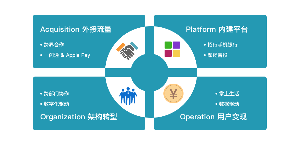 招行行长田惠宇提出转型目标是轻型银行。而向轻型银行转型重点之一是需要明确“移动优先”的数字化战略:外接流量,内建平台,用户变现,架构转型。