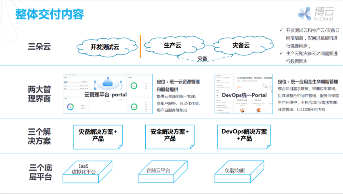 打造开发测试云、生产云和灾备云,通过容器云平台,规范应用上云标准及上云流程,实现应用在开发、测试、仿真和生产区的多环境流程扭转及持续交付。