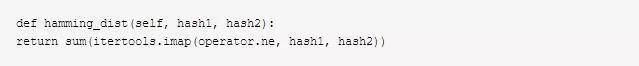 得到一个图片的“指纹”后,我们就可以与标准的图片指纹比较,怎么比较呢,应该使用“汉明距离”,也就是两个字符串对应位置的不同字符的个数。实现也很简单……