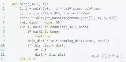 因为这是类的一个方法,所以有个self参数,无视它。这里的img应该传入一个Image对象,可以使读入图像文件后的结果,也可以是截屏后的结果。而缩放的尺寸(18,13)是我根据实际情况定的,因为顾客头像上的菜的图像基本就是这个比例。事实证明这个比例还是挺重要的,因为我们的菜有点儿相似,如果比例不合适压缩后就失真了,容易误判(我之前就吃亏了)。