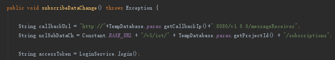 这个方法是个调用接口的方法,首先通过调用LoginService类的login()方法获取accessToken,然后再调用设备接入的创建订阅接口。创建订阅接口用于应用向平台订阅设备数据,是物联网应用向物联网平台获取数据的一种方法,本文不进行详述,感兴趣的同学可以查看我们之前的博文。