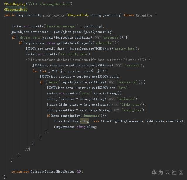这时候让我们回想一下订阅推送的机制:应用订阅后,物联网平台作为客户端推送通知给应用指定的callbackURL。没错,这个数据是物联网平台主动推送上来了,所以在这个应用中应该会有一个对应callbackURL接口的函数。