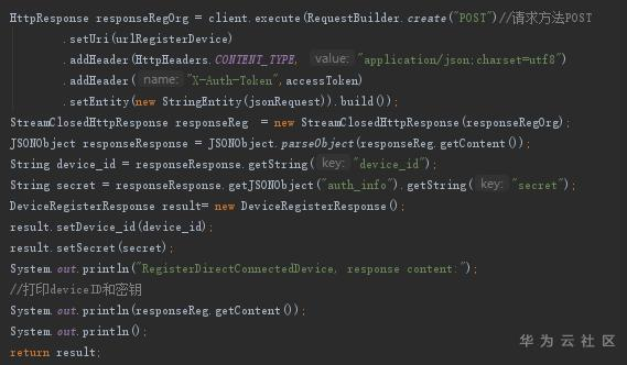 /register-device接口对应RegisterDevice类的registerDevice(@RequestBody DeviceRegisterVerifyCode deviceRegisterVerifyCode)函数,然后这个函数又调用了registerDirectConnectedDevice类的registerDirectDevice(DeviceRegisterVerifyCode deviceInfo)函数,调用了物联网平台的创建设备接口。