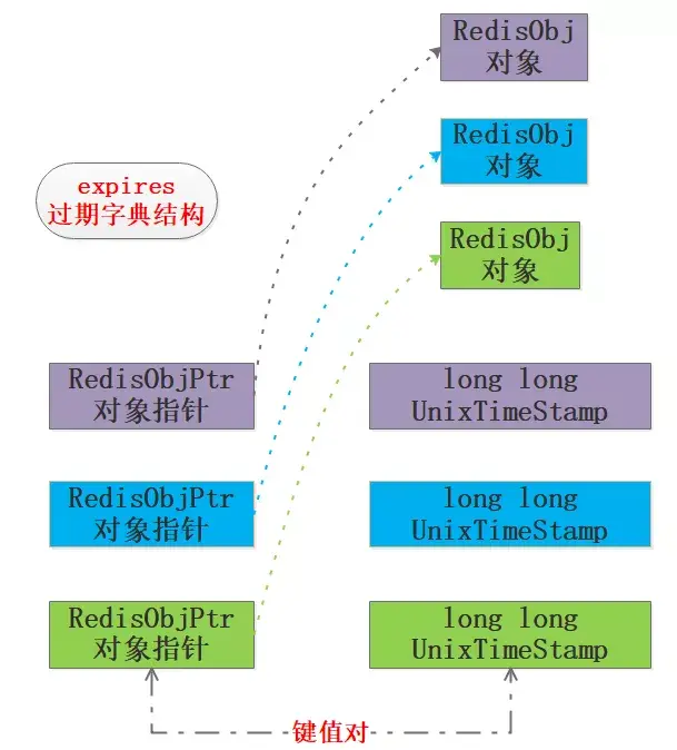 过期字典expires和键值对空间dict存储的内容并不完全一样,过期字典expires的key是指向Redis对应对象的指针,其value是long long型的unix时间戳,前面的EXPIRE和PEXPIRE相对时长最终也会转换为时间戳,来看下过期字典expires的结构,笔者画了个图: