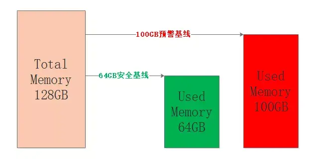 图中设定机器内存为128GB,占用64GB算是比较安全的水平,如果内存接近80%也就是100GB左右,那么认为Redis目前承载能力已经比较大了,具体的比例可以根据公司和个人的业务经验来确定。