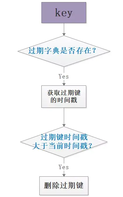 判断键是否过期可删除,需要先查过期字典是否存在该值,如果存在则进一步判断过期时间戳和当前时间戳的相对大小,做出删除判断,简单的流程如图: