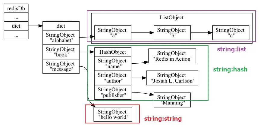 Redis本质上就是一个大的key-value,key就是字符串,value有是几种对象:字符串、列表、有序列表、集合、哈希等,这些key-value都是存储在redisDb的dict中的,来看下黄健宏画的一张非常赞的图: