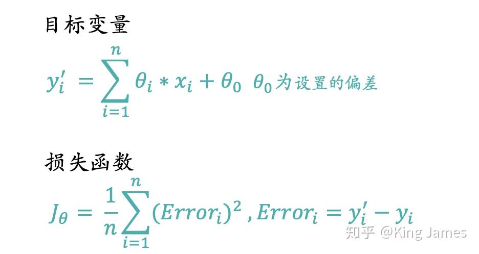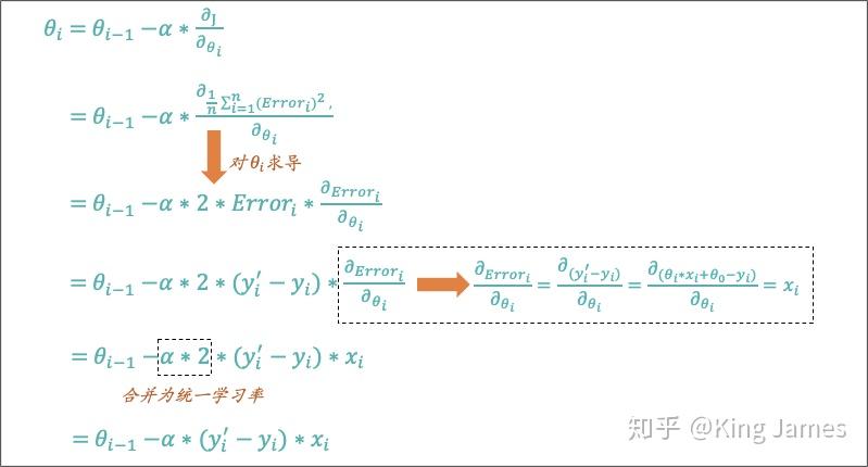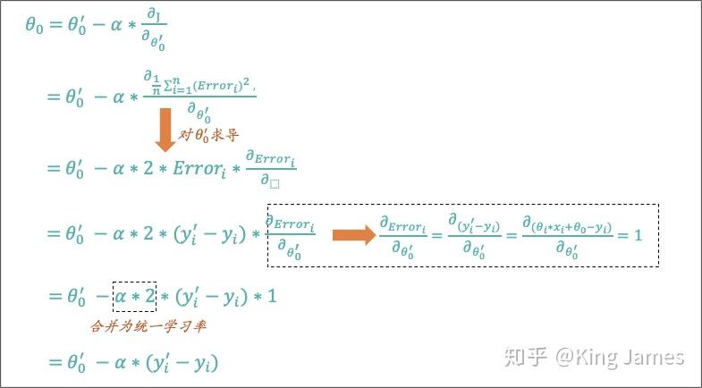 Part2.2里面的例子我们选择的是一个最简单的函数表达式,θ参数分为两种,一种是和输入变量x配对的参数θ_i,一种是固定的偏差θ_0。我们用已知的样本数据(x,y)来求解出使得损失函数最小的一组θ参数。下面我们来计算一个通用泛化的θ参数更新表达式。我们只需要用到高中数学中的导数知识即可,朋友们相信我真的很easy。
