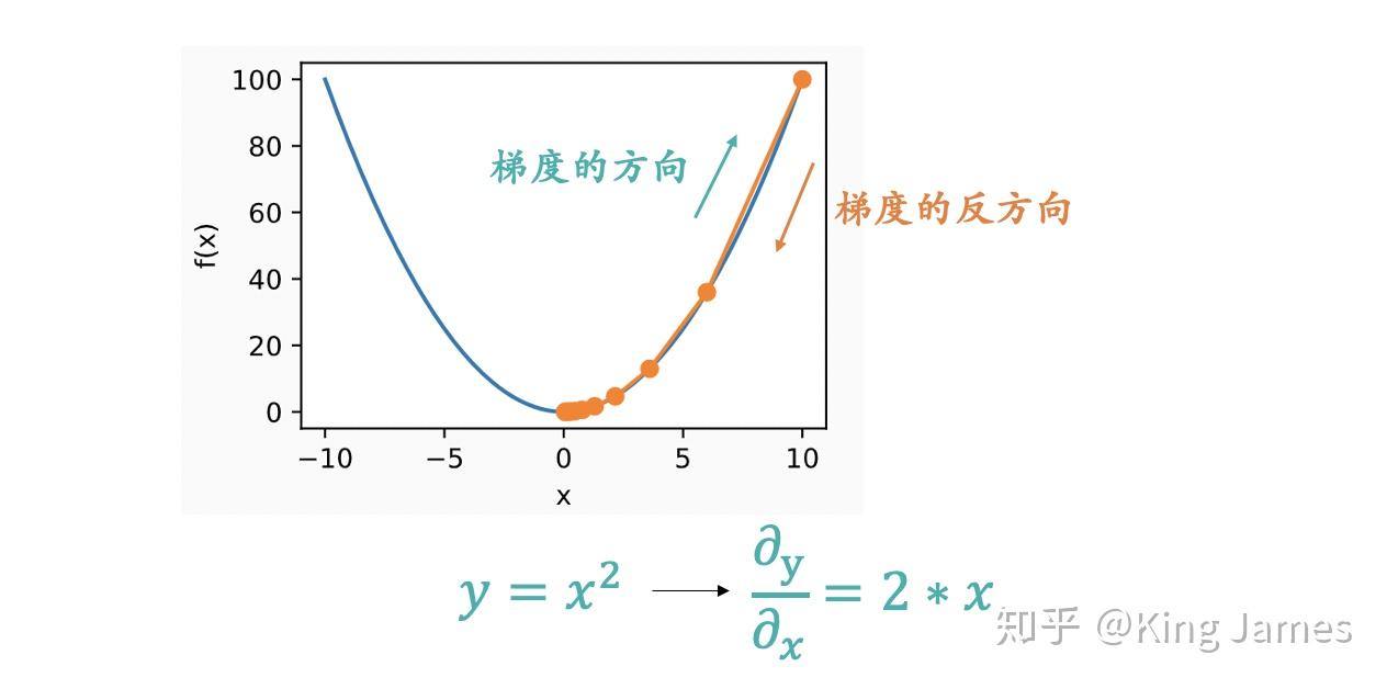 Part1里面介绍了如何从一个开口向上的抛物线高点定位到最低点的问题和下山的场景是完全类似的,抛物线就相当于一个山峰,我们的目标就是找到抛物线的最低点,也就是山底。最快的下山方式就是找到当前位置最陡峭的方向,然后沿着此方向向下走,对应到抛物线中,就是计算给定点的梯度,然后朝着梯度相反的方向( Part 2.3里面会解释为什么是朝着梯度相反的方向),就能让抛物线值下降的最快。同时我们也要和下山一样,不停地定位新位置,再计算新位置的梯度,然后按照新方向下降,最后慢慢定位到抛物线的最低点。