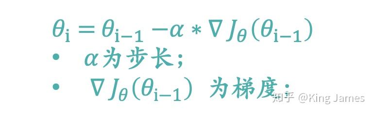 J是关于θ的一个函数,假设初始时我们在θ_1这个位置,要从这个点走到J的最小值点,也就是山底。首先我们先确定前进的方向,也就是梯度的反向“-∇J_θ”,然后走一段距离的步长,也就是α,走完这个段步长,就到达了θ_2这个点了。表达式如下图:
