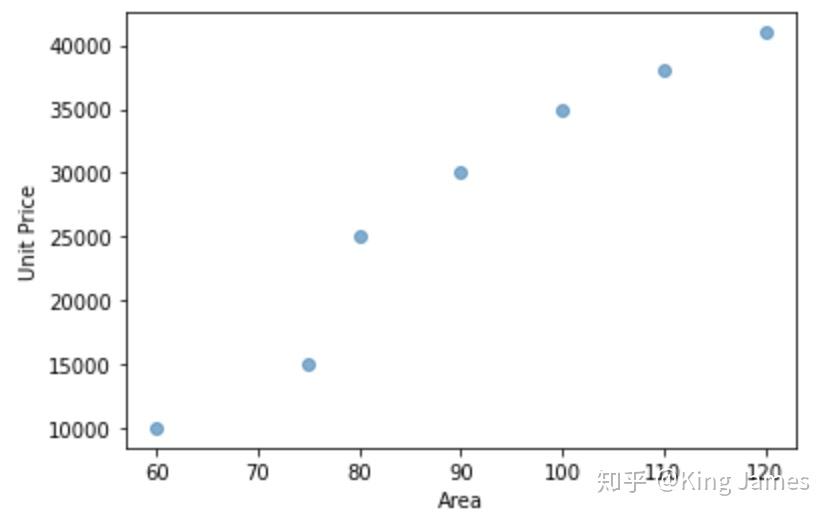 我们现在想拟合一个线性函数来表示房屋面积和房价的关系。我们初中都学过的一元一次函数表达式为:y=kx+b(k≠0)。很明显不可能有一对组合(k,b)全部经过上图7个点,我们只能尽可能地找到一对组合,使得该线性函数离上图7个点的总距离最近。