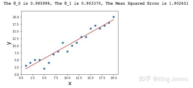 print ("The θ_0 is %f, The θ_1 is %f, The The Mean Squared Error is %f " %(θ_0,θ_1,error))