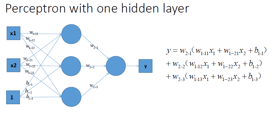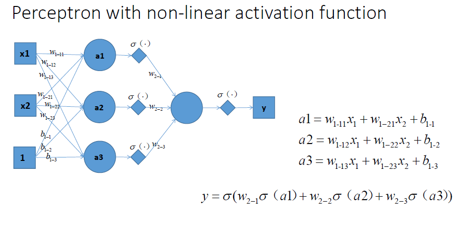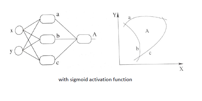 同理,扩展到多个神经元组合的情况时候,表达能力就会更强~对应的组合图如下:(现在已经升级为三个非线性感知器在组合了)