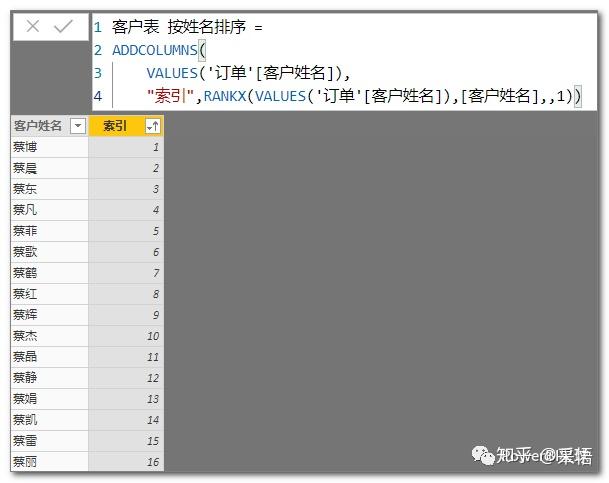 因为DAX中并没有索引函数,这里使用排名函数RANKX来代替,比如按客户姓名排序,使用排名作为索引列,