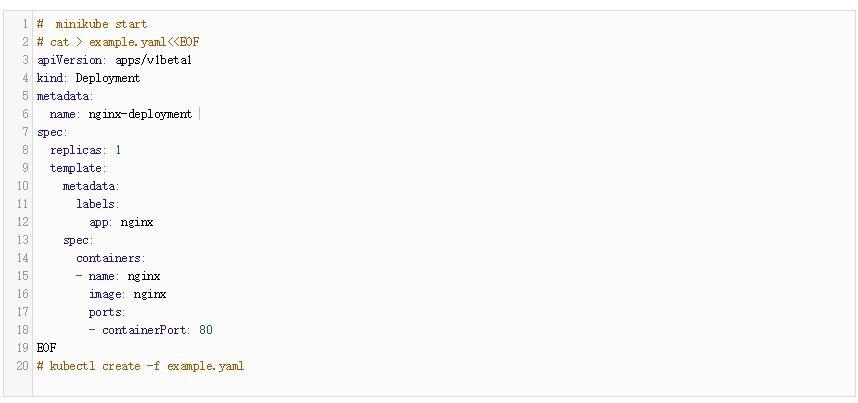 如上所示,用户使用Minikube CLI和Kubectl进行部署,这是Kubernetes的原生CLL。Minikube CLI可用于启动,停止,删除,获取状态,并在虚拟机上执行其他操作。一旦Minikube虚拟机启动,Kubectl CLI就会在Kubernetes集群上执行操作。以下命令启动现有的Minikube虚拟机并创建NGINX Kubernetes部署: