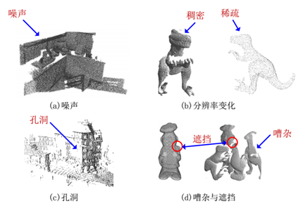 点云局部特征描述与匹配的研究已历经三十余年,尽管取得了一定的进展,例如刚体变换不变性问题的解决,但是仍然面临着如下挑战(图 3):