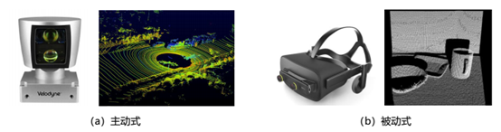 图1 典型的主动式和被动式点云传感器。(a)Velodyne 激光雷达及其扫描的点云数据,(b)ZED 立体视觉相机及其捕获的点云数据。