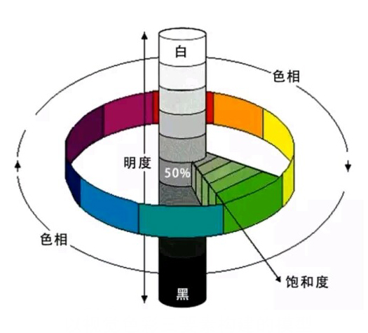 不过,这个极坐标是一个二维坐标,不能表示RGB颜色制式中的所有颜色,只能解释色相和饱和度。如何使其表示所有颜色?我们需要再添加一个纵轴,变成了这样: