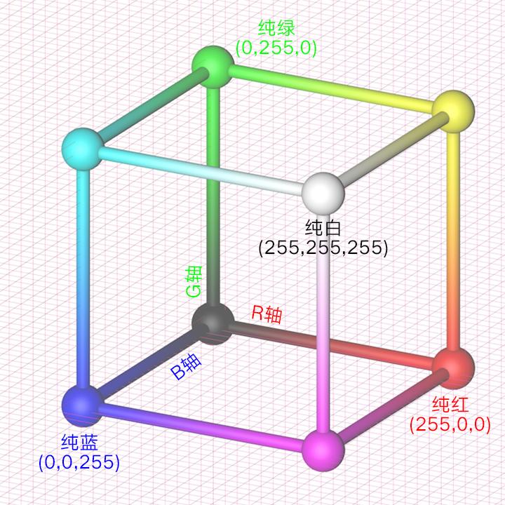 我们引入一个三维直角坐标系,三个坐标轴分别代表R、G、B的数量。由于此数值有限,所以取值范围会在立体空间里形成一个正方体。任何一个RGB颜色制式中的色彩取值,都会对应到这个立方体内的一点。