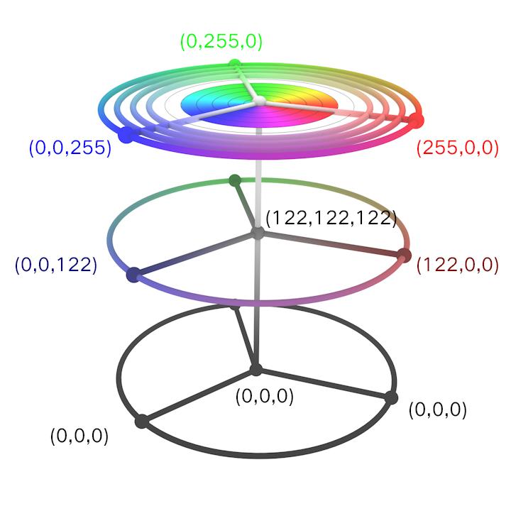 色环模型虽然也是一个立体的极坐标,但是和上一个HSV模型并不一样。区别在于: