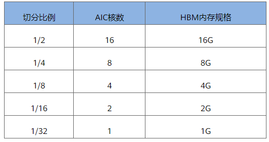 下表是昇腾910支持的基于AI Core切分的算力虚拟化典型配置: