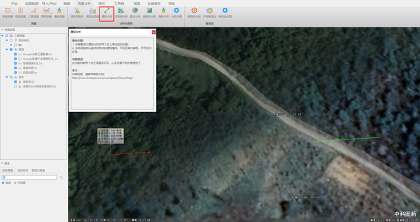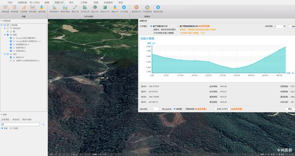还支持对多种类型地图数据进行空间分析,包括通视分析、可视域分析、雷达分析、填挖方分析、剖面分析和淹没分析、等高线预览等。