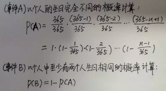 假设有n个人在同一班级内,在不考虑特殊因素的前提下,例如闰年、双胞胎,假设一年365日出生概率是平均分布的,计算至少有两个人在同一日出生的概率是多少?
